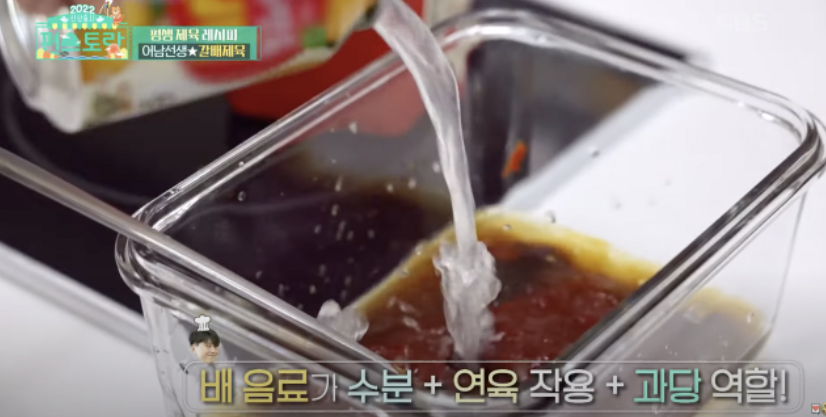여기에 들어가는 것이 바로 ‘갈아만든 배’ 음료입니다. 배음료가 수분 + 연육 작용 + 과당 역할을 해줍니다. 배음료 1캔을 넣어주면 됩니다.