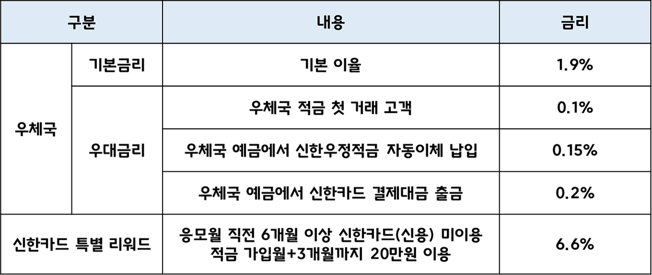 우체국 신한 우정적금의 기본금리는 1.9% 입니다. 여기에 우체국 우대금리와 신한카드 특별 리워드 이벤트 참여로 최대 금리(이율) 8.95% 를 적용받으실 수 있습니다.