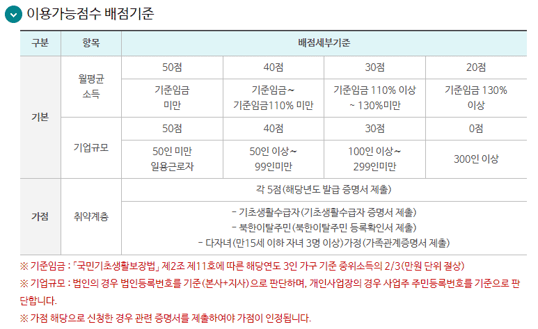 근로자 누구나 신청이 가능하지만 우선순위가 있는데요. 월소득이 낮을 수록 기업규모가 낮을 수록 점수가 높으며 취약계층의 경우에는 가산점이 주어집니다.