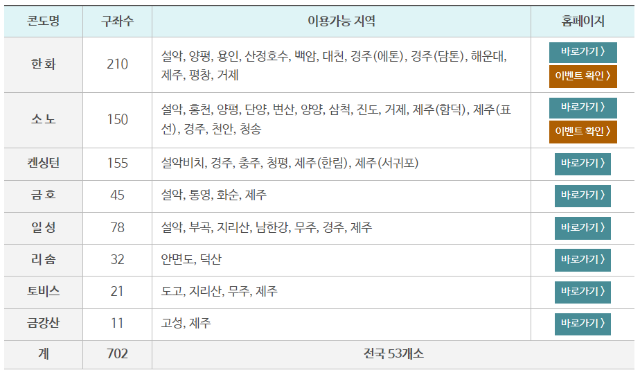 설악, 양평, 지리산 등 전국 53개소 콘도를 이용가능합니다.