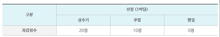 한사람이 여러번 이용하는 것을 방지하기 위해 한번 이용할때마다 1박당 점수가 차감됩니다. (만일 취소할 경우에도 이용가능점수가 차감됩니다.)