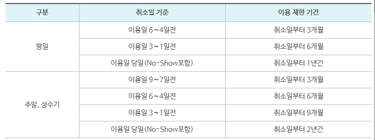 이용취소의 경우 이용일 기준 10일 이전에 취소처리를 해야합니다. 만일 취소 가능기간 이후에 취소할 시에는 불이익을 받을 수 있습니다.
