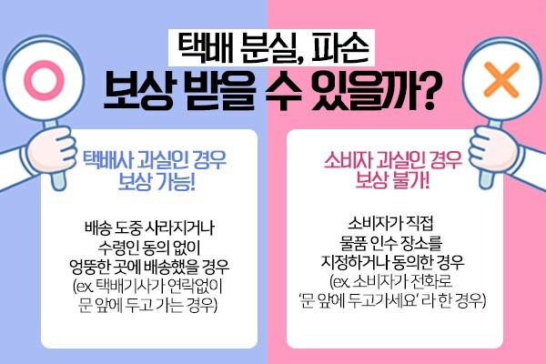 만일 택배사의 과실로 인해 택배 배송 사고가 났을 경우 신고를 하여 보상을 받을 수 있습니다.