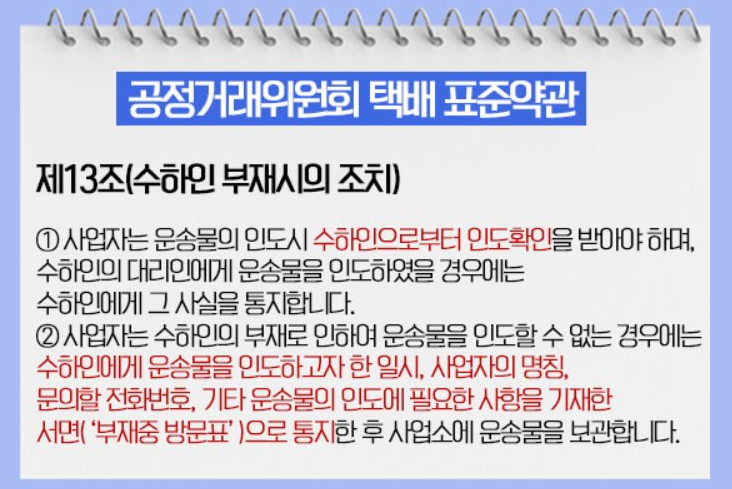 또한, 고객의 부재로 인하여 운송물을 인도할 수 없는 경우 고객과 합의된 장소에 보관하게 할 수 있으며 이 경우 합의된 장소에 보관하는 때에만 고객에게 인도가 완료된 것으로 봅니다.