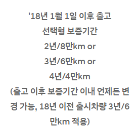 2018년 이후에 출고된 차량은 2년/8만km, 3년/6만km, 4년/4만km 이렇게 3가지 중 선택이 가능합니다(출고 이후 보증기간 이내여야함)