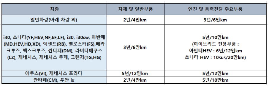 현대자동차의 보증수리 기간은 차체 및 일반부품은 3년 6만km, 엔진 및 동력 전달 부품은 5년 10만km를 기본적으로 보증하고 있습니다.