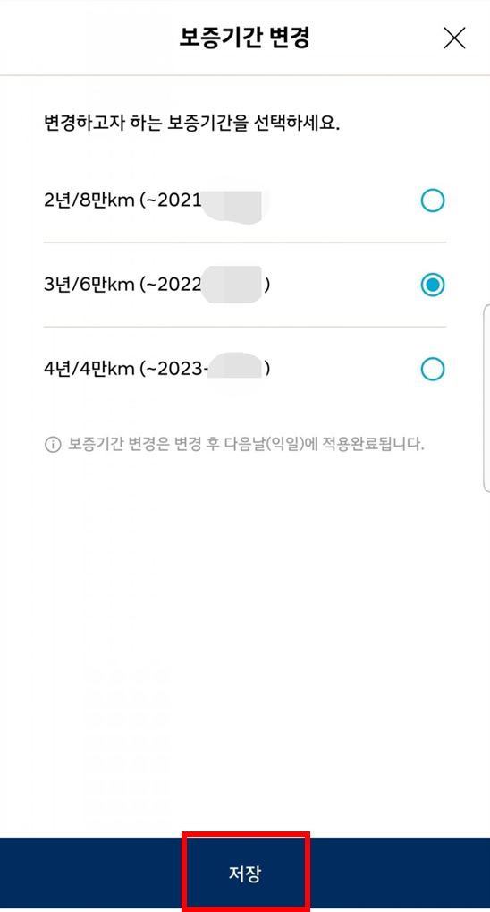 이후 원하시는 보증기간을 선택 후 저장을 클릭하시면 변경이 완료됩니다.