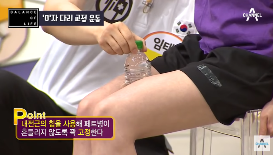 이때 다리는 11자를 유지해야 하며 내전근의 힘을 사용하여 페트병이 흔들리지 않도록 꽉 고정을 합니다.