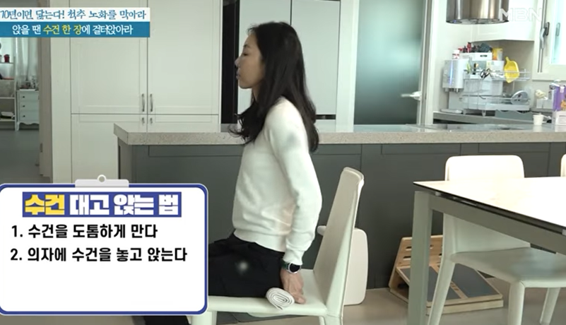 수건 1장을 돌돌 말아서 의자의 정가운데 놓습니다. 그런 뒤에 엉덩이 뒤쪽에 수건이 오게끔 살짝 걸터 앉는 느낌으로 앉아주시면 됩니다. 이때 엉덩이와 허리가 수건 뒤로 넘어가지 않도록 해야합니다.