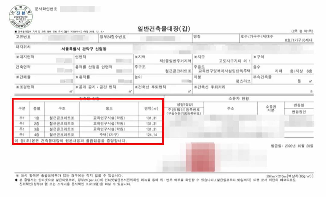 여기서 1,2,3층의 경우 학원으로 되어있고 4층은 주택으로 되어 있는 것을 알 수 있습니다.