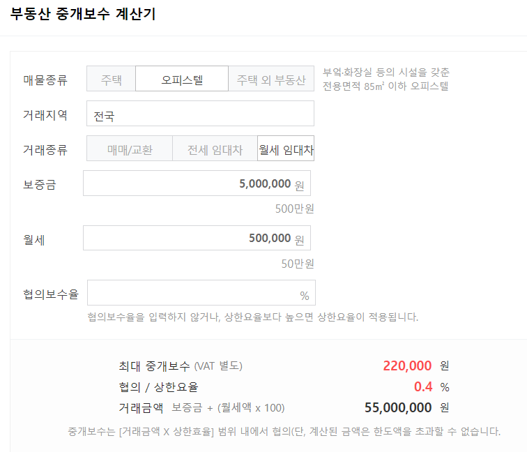매물의 종류, 거래지역, 거래 종류, 보증금, 월세를 입력하면 자동으로 중개보수가 나타나게 됩니다.