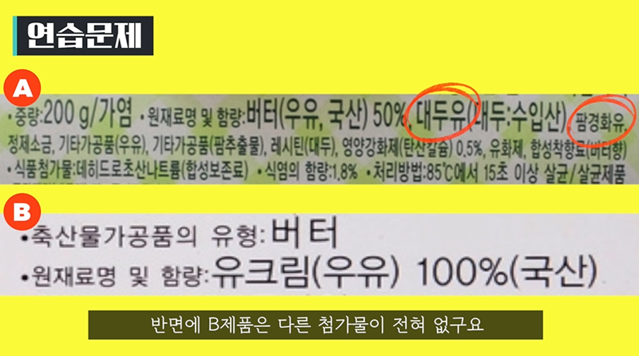 한 가지 예시를 들자면 아래 두 제품 모두 버터지만 A제품의 경우 대두유, 팜 경화유와 같은 식용유가 들어가지만 B 제품은 첨가물 없이 100% 우유로 만들어진 것을 알 수 있습니다.