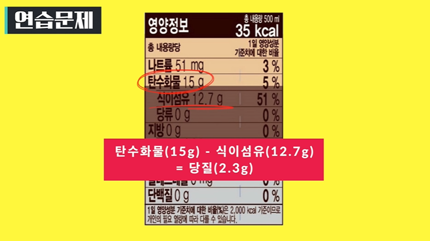 위의 예에서 식이섬유가 있다면 탄수화물 – 식이섬유가 당질이고 식이섬유가 표시되어 있지 않다면 탄수화물의 양이 곧 당질을 의미합니다.
