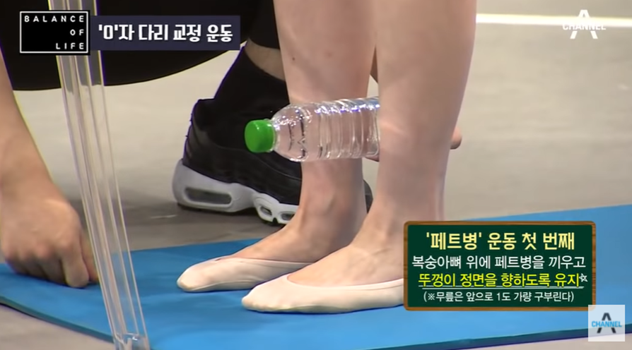 이때 다리는 11자를 유지해야 하며 내전근의 힘을 사용하여 페트병이 흔들리지 않도록 꽉 고정을 합니다.