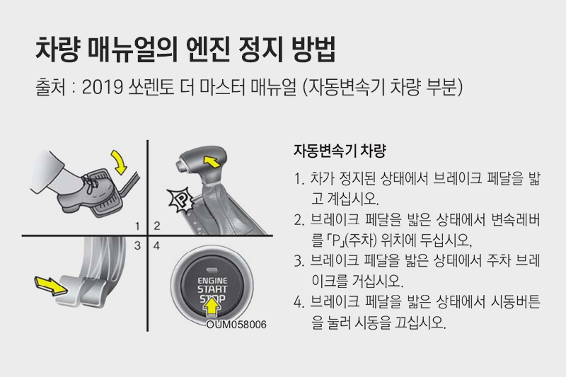 앞서 말씀드린 매뉴얼의 주차브레이크 사용법과 달리 엔진 정지 방법에는 ‘브레이크 페달을 밟은 상태에서 P 기어를 넣고 주차브레이크를 걸라’고 나와 있습니다.