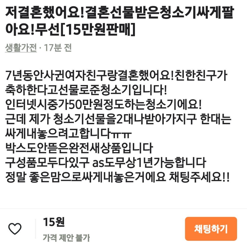 청소기, 냉장고와 같은 가전제품을 싸게 판다고 글이 올라오는데요. 대부분 2개가 있어서 하나는 판다는 식의 레파토리 입니다.